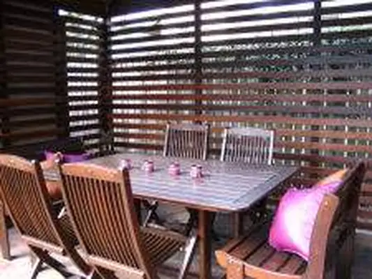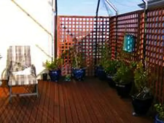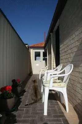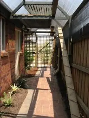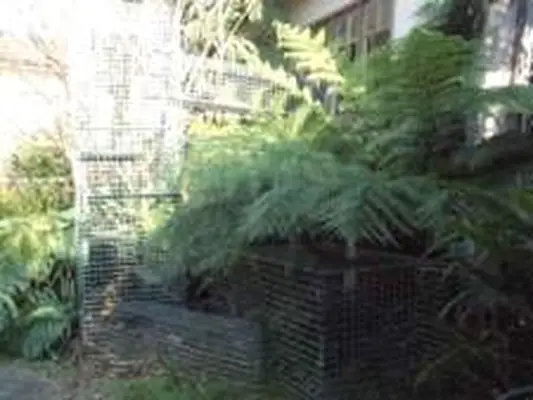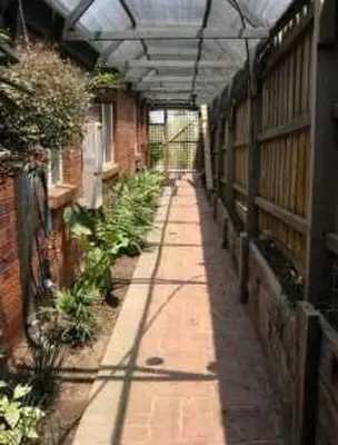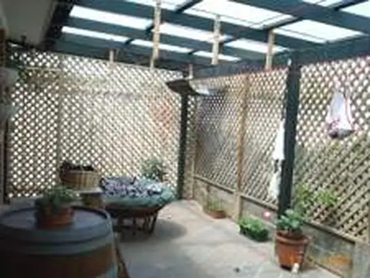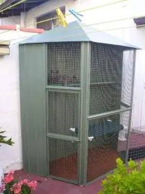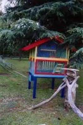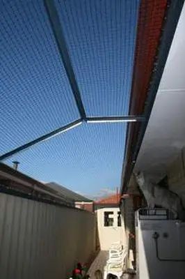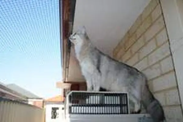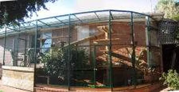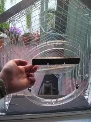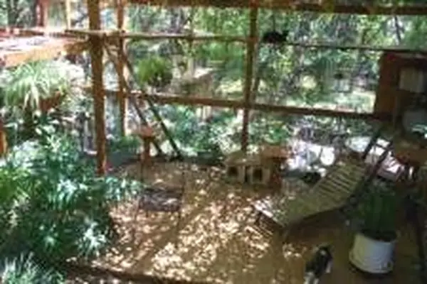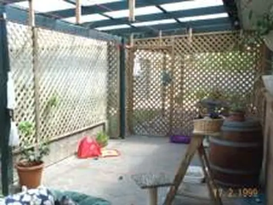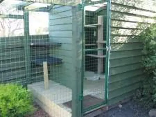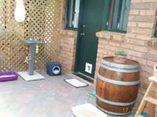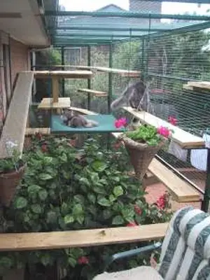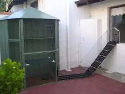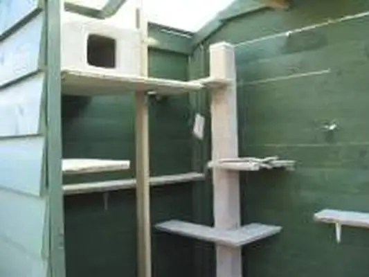 È chiuso con una rete di legno e i gatti lo adorano, poiché possono arrampicarsi e scendere l'armatura. C'è anche una rete che può solo arrampicarsi. È abbastanza alto per i gatti adattare ai loro vicini. Il tetto lascia attraverso la luce, ma è resistente ai raggi di calore e UV.