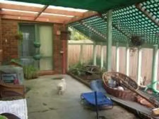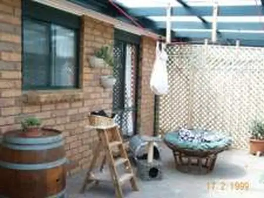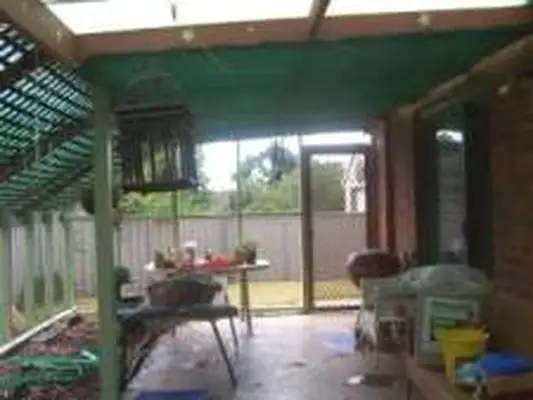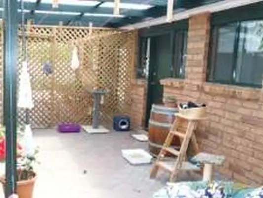 La manovra in tessuto ombra era originariamente installata per tenere il sole lontano da casa nel pomeriggio, ma divenne un'aggiunta di una porta sud. Attualmente, l'estremità nord ha una porta del garage collegata alla casa da una porta standard (nessuna porta del gatto a causa dell'allarme della casa). Da questo, è cresciuto fino a una gara di allattamento lungo la recinzione, che consisteva anche in due case in stile cubi, una delle quali è stata ora sostituita da un'area di vasta area (come si vede nelle foto). Ciò era dovuto a una recente incorporazione nella famiglia, un Burman chiamato Rascal. Ci sono più piani per ricostruire il patio posteriore, che includerà altre estensioni per la gara esistente.